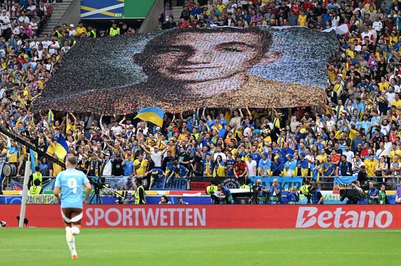 Durante o jogo da Ucrânia, os adeptos ucranianos mostraram uma faixa com a imagem de Nazariy Hryntsevich, conhecido pelo nome de código “Hrienka”.
