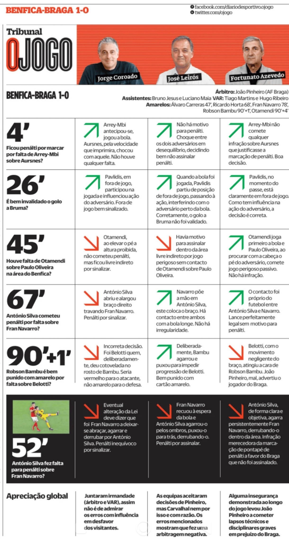 O ex-árbitro português Jorge Coroado, que atualmente analisa arbitragem no jornal O Jogo, comentou a performance de João Pinheiro após a vitória do Benfica por 1-0 sobre o SC Braga.
