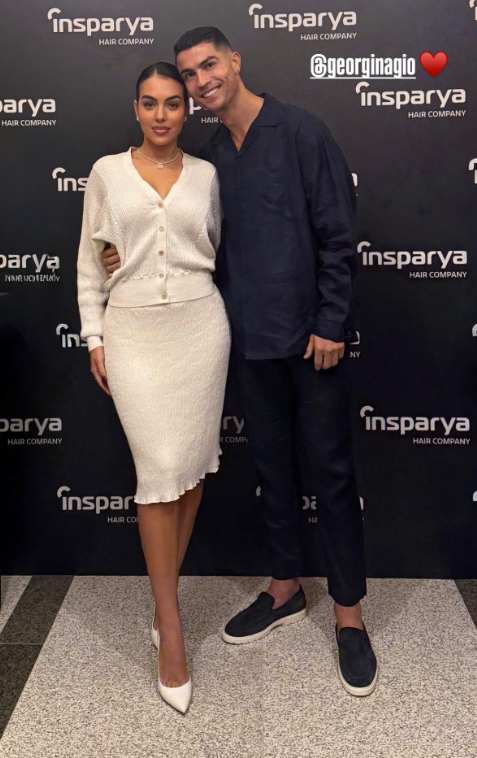 O casal mais mediático do momento marcou presença no evento — Ronaldo optou por um visual total black, com camisa e calças em alfaiataria, enquanto Georgina Rodríguez deslumbrava num look sofisticado em tons claros, composto por saia lápis e scarpins elegantes.