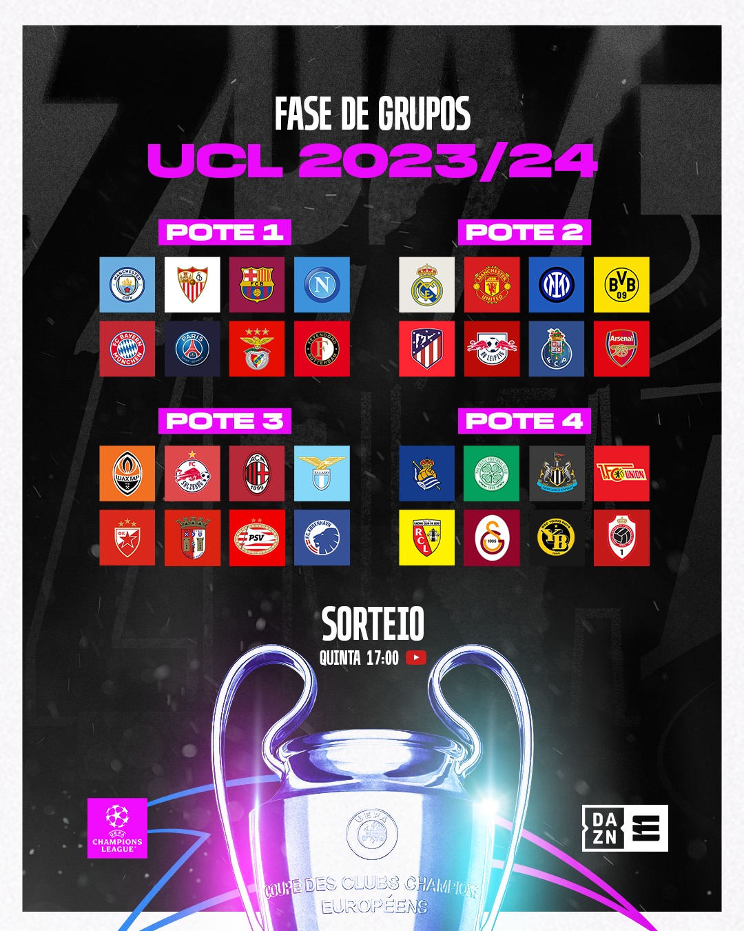 SL Benfica, FC Porto e SC Braga são os representante portugueses que marcarão presença hoje, pelas 17 horas, no Mónaco, no sorteio da fase de grupos da Liga dos Campeões, edição 2023/2024.