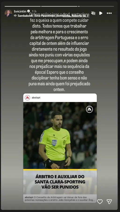 No dia seguinte à polémica vitória do Sporting nos Açores, neste domingo, o Santa Clara formalizou uma queixa contra a equipa de arbitragem que esteve presente na partida, liderada por João Gonçalves. A confirmação chegou através de Bruno Vicintin, presidente da SAD do clube açoriano, em uma publicação nas redes sociais.